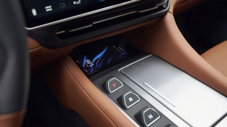 Khu vực điều khiển: Nút chuyển số trực quan cùng sạc không dây tích hợp trên bệ tì tay.